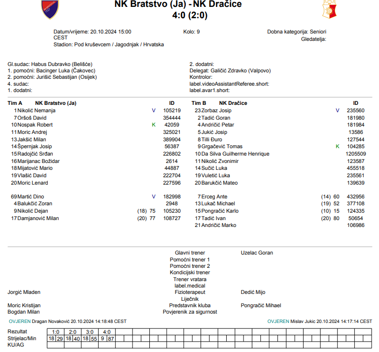 “Prvo bih čestitao gostima na fer i korektnoj igri. Bili smo bolji cijelu utakmicu, stvarali smo mnoštvo prilika i nakon odličnog prvog poluvremena odlazimo na predah s 2 gola prednosti (2:0). U drugom poluvremenu smo nastavili u istom ritmu, i dalje stvarajući puno prilika, a na kraju postižemo još 2 pogotka, te je rezultat na kraju utakmice 4:0. Čestitam i svojim igračima na odličnoj utakmici i nadam se da idući vikend idemo po prvu gostujuću pobjedu, u koju ne sumnjam budemo li igrali i borili se kao danas. Suđenje je bilo odlično, a gostima želim sreću u nastavku prvenstva.” – izjavio je Kristijan Moric, trener Bratstva.
