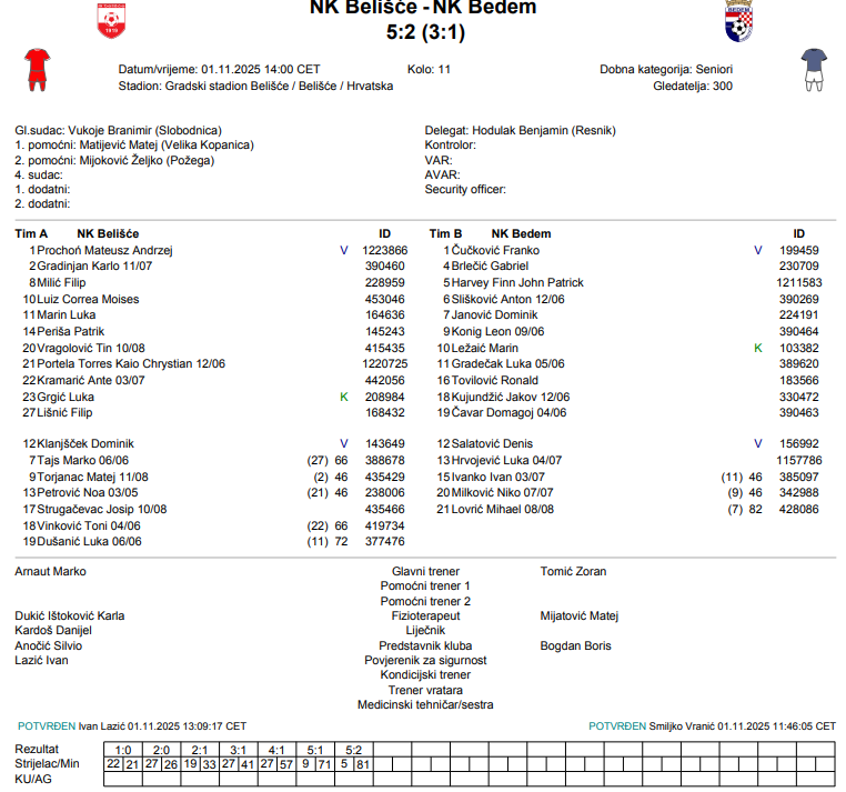Pobjeda u Dalju vratila je Belišće u pobjednički kolosijek, na domaćem terenu ove sezone zna biti problema, no protiv Bedema to nije bio slučaj, sve je odlučeno već u prvom poluvremenu. Ante Karamatić je u 21. minuti načeo goste, pet minuta nakon toga po prvi put se u strijelce upisao Filip Lišnić. Domagoj Čavar je nakratko vratio nadu Bedemu, no do odmora Lišnić zabija i svoj drugi pa se na poluvrijeme otišlo s +2 za Belišće. Lišnić je zabio i u nastavku za 4:1, zatim se na listu strijelaca ubilježio i Matej Torjanac, dok je posljednji gol na utakmici djelo gostujućeg John Finna koji je tako poraz u Belišću učinio rezultatski pristojnim.