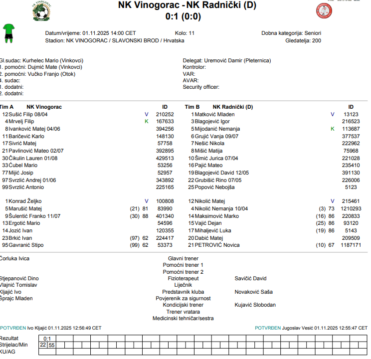 Pala knjiga na dva slova. Do nedavno je “pola” lige bilo bez boda u gostima, a onda u subotu osim Valpovke taj loš učinak prekida i Radnički pa sada na popisu “simpatičnih” gostiju ostaju samo Bedem i Vuteks koji ovu jesen koriste isključivo za turističko razgledanje Slavonije i Baranje. Prva pobjeda u gostima Radničkom puno znači, prije svega na psihološkom, a onda i rezultatskom planu. Brzo su “ispravili” domaći poraz i vratili se u ritam od 50% osvojenih bodova. Dva su trenutka odlučila dvoboj u Vinogorju, prvi se dogodio u 55. minuti kada je Rino Grubišić svladao Sušića za 0:1, a drugi u posljednjim trenucima utakmice kada je Mladen Matković “skinuo” penal domaćem kapetanu Filipu Mrvelju i obranio tu pobjedu Radničkog. Vinogorcu je ovo već treći domaći poraz ove sezone i potpuno je jasno zašto su na ljestvici tu gdje jesu.