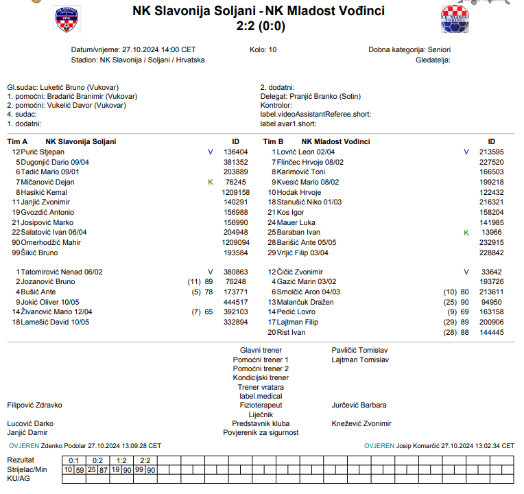 Prava dramatična utakmica odigrana je danas u Soljanima gdje je na kraju završilo podjelom bodova. Mreže su mirovale u prvom dijelu, a zatim su gosti iz Vođinaca došli u vodstvo golom Hrvoja Hodaka. Igrala se 87. minuta kada je Ivan Baraban povećao vodstvo Mladosti te se činilo da sva tri boda odlaze u vođince. No onda je uslijedila prava drama. Prvo je u 90+2. minuti za domaće pogodio Antonio Gvozdić, a minutu nakon toga Bruno Šikić pogađa za konačnih 2:2.