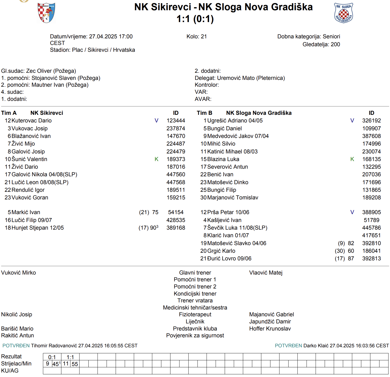 Sloga Nova Gradiška i Sikirevci odigrali su 1:1 u tvrdoj i borbenoj utakmici. Gosti su poveli preko Jakova Medvedovića u prvoj minuti sudačke nadoknade prvog poluvremena, no domaći su brzo odgovorili. Dario Živić zabio je za konačnih 1:1 u 55. minuti, čime su Sikirevci pomogli Kutjevu da se bodovno izjednači sa Slogom na vrhu tablice