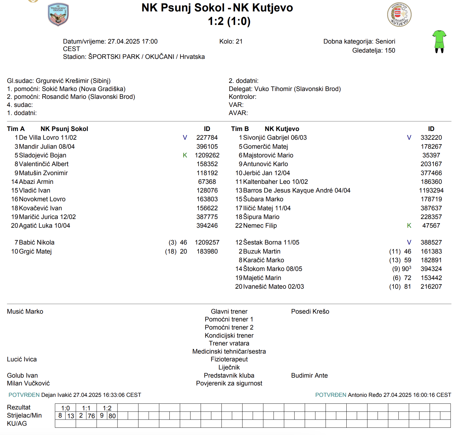 – Prvo poluvrijeme nismo se pojavili na terenu, užas je najblaža riječ koju mogu upotrijebiti. Drugo poluvrijeme smo se malo presložili i pritiskali ostavljajući svjesno dosta prostora domaćinu za kontru i polu kontru koju na našu sreću nisu kaznili, dok smo mi uspjeli na mišiće preokrenuti. Sad smo tamo gdje želimo biti, i dati će mo ama baš sve da tu i ostanemo. – dodao je trener Kutjeva, Krešo Posedi.
