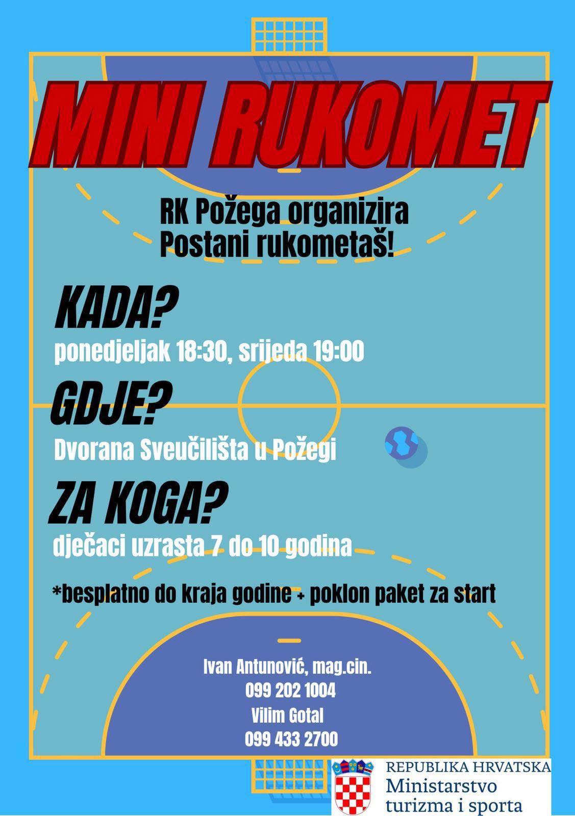 Rukometni klub Požega otvara vrata svim dječacima uzrasta od 7 do 10 godina i poziva ih da postanu dio obitelji MINI rukometa! Mini rukomet idealan je način da dijete razvije ljubav prema sportu, a istovremeno usvoji osnovne motoričke i društvene vještine. Ova dinamična igra sadrži elemente više sportova – brzinu, preciznost, koordinaciju i timski duh – pa se s razlogom može nazvati modernim desetobojem za najmlađe.