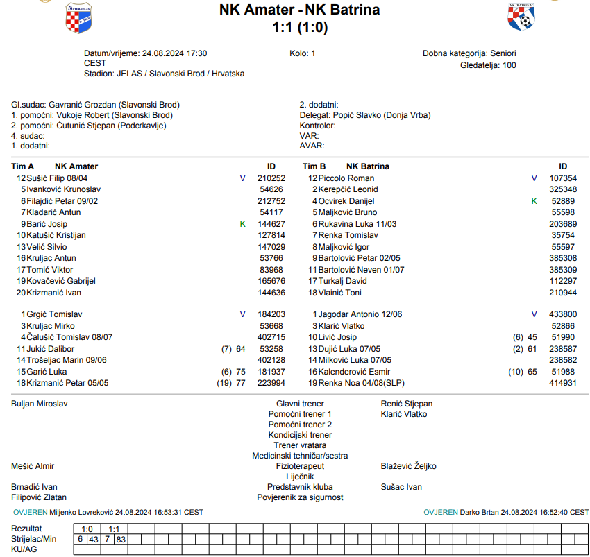 1 | 24.08.2024 17:30 | Slavonski Brod | NK Amater – NK Batrina | 1:1 | |