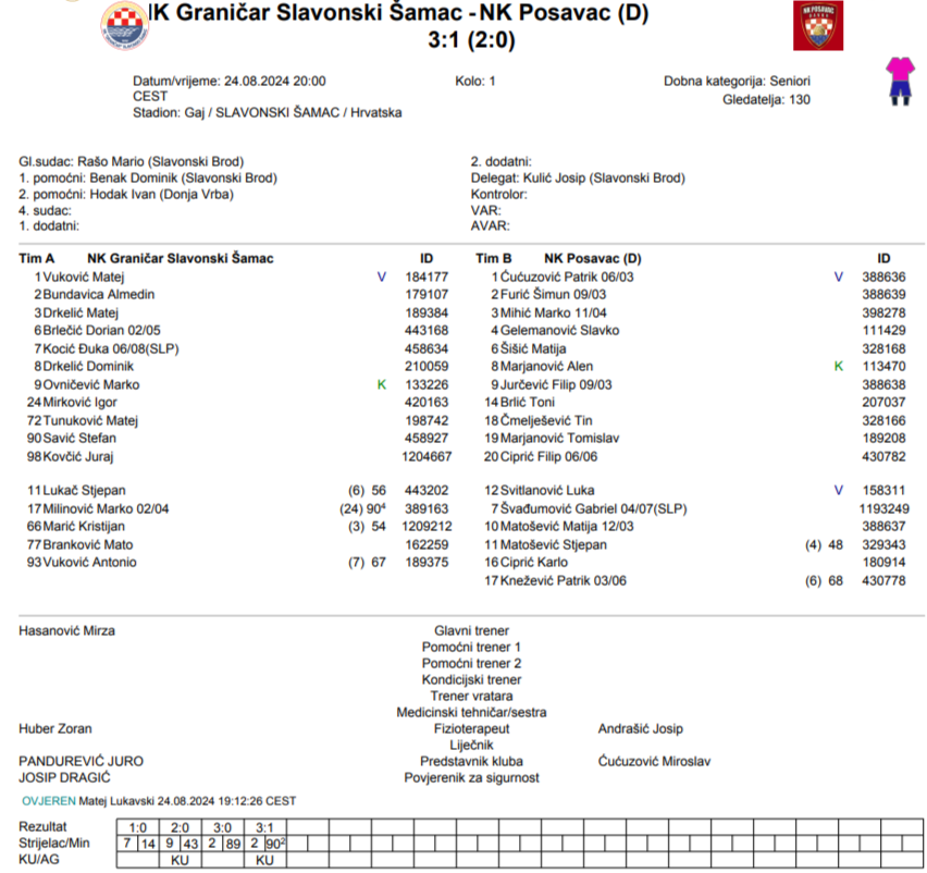 1 | 24.08.2024 20:00 | SLAVONSKI ŠAMAC | NK Graničar Slavonski Šamac – NK Posavac (D) | 3:1 | |